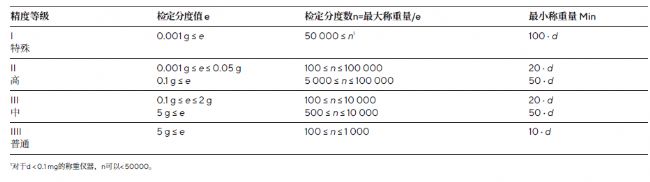 精度等級決定了適用的稱重范圍,該范圍受限于儀器的最小稱重量(Min)的下限,以及儀器最大稱重量(Max)的上限。在法律相關應用中,不可用于稱量低于最小稱重量的物體或物質。參見表1。