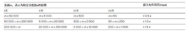 表2:經合格評定的稱重儀器的最大允許誤差取決于OIML R 76 1:2006規定的精度等級和負載。