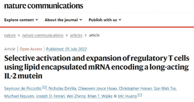 2022年7月5日,Moderna公司的Eric Huang等人在Nature Communications期刊發表了題為:Selective activation and expansion of regulatory T cells using lipid encapsulated mRNA encoding a long-acting IL-2 mutein(使用脂質封裝的編碼長效 IL-2 突變蛋白的 mRNA 可選擇性激活和擴增調節性 T 細胞)的研究論文。