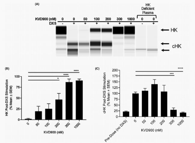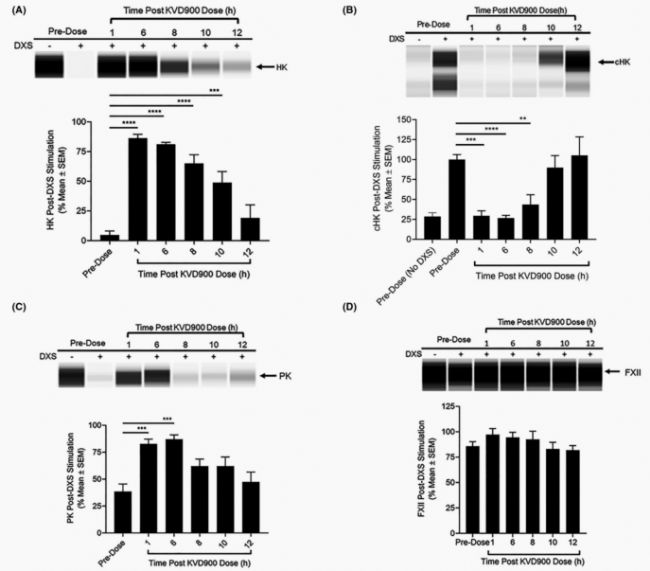 美國(guó)KalVista Pharmaceuticals公司的科學(xué)家在本項(xiàng)研究中和2022年發(fā)表的“Pharmacological suppression of the kallikrein kinin system with KVD900: An orally available plasma kallikrein inhibitor for the on-demand treatment of hereditary angioedema”研究中利用全自動(dòng)毛細(xì)管Digital Western技術(shù)探究藥物的量效和時(shí)效關(guān)系,并定量檢測(cè)高分子量激肽原(High molecular weight kininogen,HK)、血漿激肽釋放酶(Plasma kallikrein)和凝血因子XII(Factor XII cleavage)。