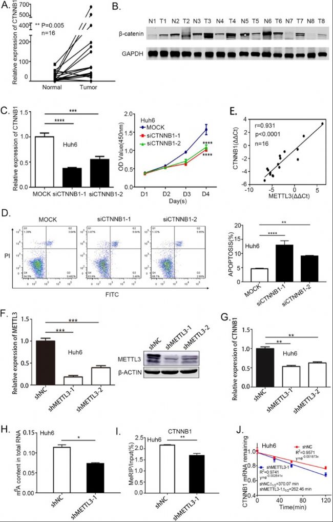 m6A修飾對mRNA的穩定性、剪接和翻譯的調控具有重要意義。然而,它在癌癥中的作用尚未被詳細研究,為進一步研究m6A修飾在肝母細胞瘤(HB)中的生物學作用和潛在機制,本研究評估了肝母細胞瘤(HB)組織中m6A的水平,及其關鍵催化基因和整體m6A轉錄組水平概況。研究結果表明METTL3是參與異常m6A修飾的主要因素。此外還分析靶基因CTNNB1,探討了甲基轉移酶METTL3在HB中參與調控CTNNB1的機制。