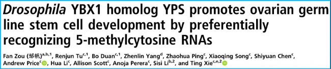 2020年02月18日,Stower研究所解亭教授團隊與南方科技大學李思思團隊合作研究發現果蠅的YPS蛋白通過優先結合帶有m5C修飾的RNA,從而促進果蠅卵巢生殖干細胞的發育。該成果以“Drosophila YBX1 homolog YPS promotes ovarian germ line stem cell development by preferentially recognizing 5-methylcytosine RNAs”為題在線發表在《美國國家科學院院刊》(PNAS)(IF 11.205)期刊上。