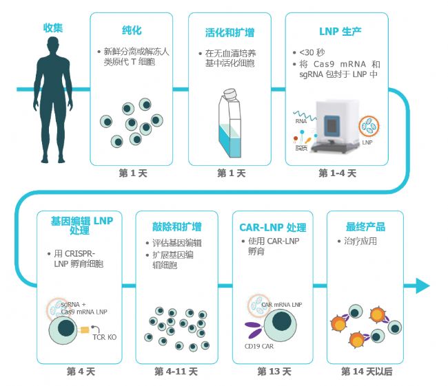 第 1 天 - 解凍并活化凍存的人類原代 Pan T 細(xì)胞。第 1-4 天 – 生產(chǎn) LNP,評(píng)估 RNA 包封效率以確定劑量。第 4 天 - 活化的 T 細(xì)胞與基因編輯 RNA-LNP 一起孵育。第 4-11 天 - 細(xì)胞擴(kuò)增以增加細(xì)胞數(shù)量用于隨后的實(shí)驗(yàn)。第 13 天 - 用 CAR mRNA-LNP 處理基因編輯細(xì)胞,表達(dá)治療性抗 CD19 CAR 蛋白。第 14 天 – CAR 處理后約 24 小時(shí),進(jìn)行針對(duì)腫瘤靶標(biāo)的細(xì)胞毒性試驗(yàn)。