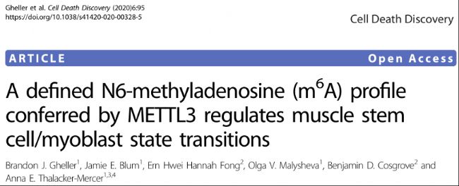 標題:A defined N6-methyladenosine (m6A) profile conferred by METTL3 regulates muscle stem cell/myoblast state transitions(METTL3介導的m6A甲基化譜調(diào)控肌肉干細胞成肌細胞狀態(tài)轉(zhuǎn)換)