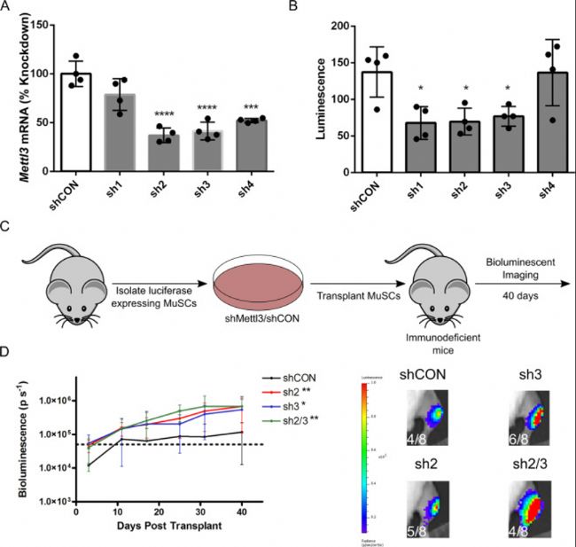 圖5:Mettl3敲低增強了初次移植后的MuSC植入