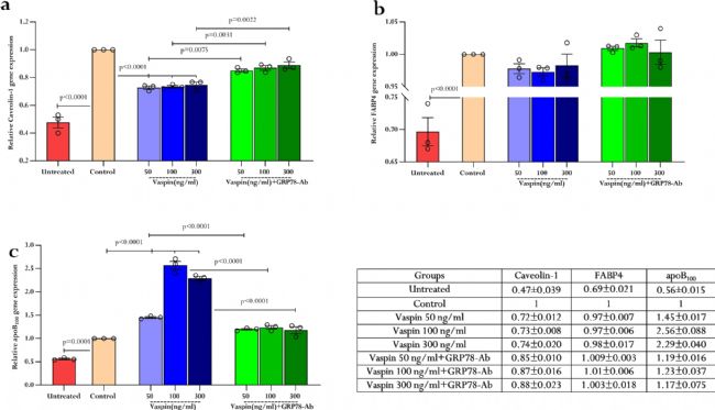 Vaspin改變了FFA處理的HepG2細(xì)胞系中Caveolin-1、FABP4和apoB100的表達(dá)水平。圖1顯示,與未處理組相比,F(xiàn)FA處理的細(xì)胞中基因表達(dá)顯著增加。24 小時(shí)后,vaspin(50、100、300 ng/ml)顯著降低Caveolin-1表達(dá),并降低FABP4基因表達(dá),但這些變化不顯著。apoB100的表達(dá)水平較對(duì)照組顯著升高。用1:2000稀釋的GRP78-Ab溶液處理細(xì)胞從而抑制GRP78受體,這顯著阻斷了三種濃度下vaspin對(duì)Caveolin-1和apoB100表達(dá)水平的影響。
