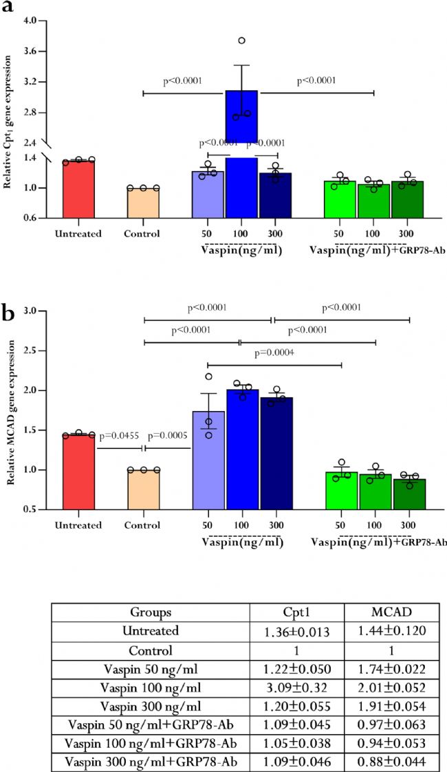 圖2 Vaspin增加FFA處理的HepG2細(xì)胞系中CPT1和MCAD基因的表達(dá)。通過RT-qPCR 分析并與FFA 處理的 HepG2 細(xì)胞系中 GRP78 Ab 共處理24 h 分析50、100、300 ng/ml vaspin 對(duì)CPT1和 MCAD 基因的影響。