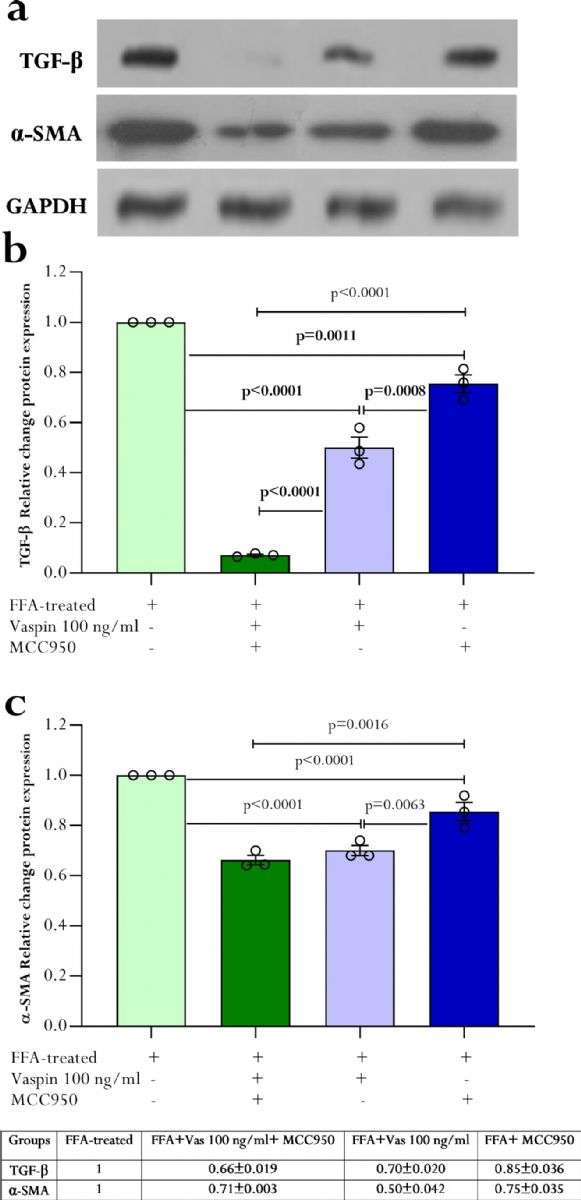 與各自的對(duì)照組相比,Vaspin(100 ng/ml)顯著降低了FFA處理(96小時(shí))的共培養(yǎng)的HepG2和LX-2細(xì)胞中TGF-β1和α-SMA的蛋白質(zhì)水平(圖4 b、c)。同樣,與FFA處理組相比,MCC950處理組的TGF-β1和α-SMA蛋白顯著減弱。這一結(jié)果表明,與MCC950相比,vaspin在降低TGF-β1方面比α-SMA具有更強(qiáng)的潛在作用。