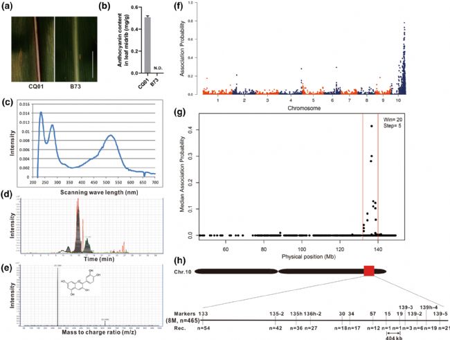 (a)玉米自交系CQ01和B73的葉中脈。(b) CQ01生長(zhǎng)30天后葉中脈的花青素含量。(c) LC-MS/MS在不同掃描波長(zhǎng)下的信號(hào)強(qiáng)度。(d) LC-MS/MS檢測(cè)花青素的保留時(shí)間和信號(hào)強(qiáng)度。(e) 花青素組成成分檢測(cè)。(f)BSR-seq分析將花青素調(diào)控基因定位到10號(hào)染色體 (B73 RefGen_v3)。(g) 采用滑動(dòng)窗口法將花青素調(diào)控基因定位到10號(hào)染色體132-140Mb區(qū)間。(h) 利用CQ01(紫色中脈)和ZN3(綠色中脈)之間具有SNP多態(tài)性的13個(gè)KASP分子標(biāo)記,對(duì)465個(gè)京紫糯219 (ZN3×CQ01)的F2代個(gè)體進(jìn)行精細(xì)定位,將葉中脈花青素調(diào)控基因定位于KASP-15和KASP-19標(biāo)記之間的404kb區(qū)間。