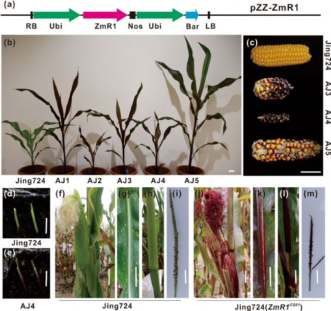 (a) ZmR1過表達(dá)載體的結(jié)構(gòu)。(b) 野生型京724和5個(gè)獨(dú)立的過表達(dá)ZmR1CQ01的京724(T0代)中花青素積累的表現(xiàn)型。(c-m) 野生型京724和過表達(dá)ZmR1CQ01的京724的不同組織中的花青素積累。花青素在玉米粒(c)、胚芽鞘(d和e)、玉米須(f和j)、苞片(f和j)、葉(g和k)、葉中脈(g和k)、葉鞘(h和l)、莖(h和l)、花藥(i和m)和雄花序(i和m)中積累。