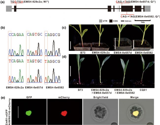 (a) 3個(gè)B73 zmr1 EMS突變體的突變位點(diǎn)和核苷酸變異情況。(b) 突變位點(diǎn)測(cè)序結(jié)果。(c-d) 野生型B73、3個(gè)B73 zmr1 EMS突變體(c)、2個(gè)突變體雜交植株和CQ01(d)的葉鞘中花青素積累的情況。(e) 通過對(duì)玉米原生質(zhì)體的瞬時(shí)表達(dá)分析ZmR1的亞細(xì)胞定位。