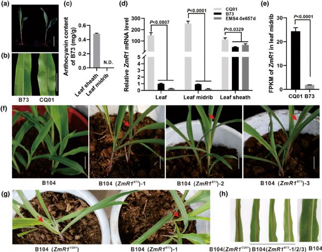 (a-b) B73和CQ01在葉鞘(a)和中脈(b)中的花青素積累。(c) B73生長(zhǎng)30天后葉鞘中花青素的含量。(d)在生長(zhǎng)30天的B73、CQ01和B73 zmr1 EMS突變體的葉鞘(靠近地面)、葉片和中脈中ZmR1的表達(dá)水平。(e)通過轉(zhuǎn)錄組分析鑒定生長(zhǎng)30天的CQ01和B73葉中脈中ZmR1的FPKM值。(f) 生長(zhǎng)30天的野生型B104和過表達(dá)ZmR1B73的轉(zhuǎn)基因B104中花青素色素沉著的比較。(g-h) 過表達(dá)ZmR1B73的轉(zhuǎn)基因B104和過表達(dá)ZmR1CQ01的轉(zhuǎn)基因B104在生長(zhǎng)30天時(shí)花青素色素沉著的比較。
