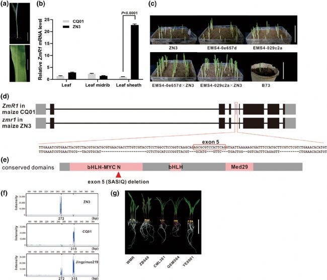 (a) 花青素不在ZN3的葉鞘和中脈積累。(b) 生長(zhǎng)30天的ZN3和CQ01的葉片、中脈和葉鞘中ZmR1的表達(dá)量比較。(c) 通過zmr1 EMS突變體等位基因測(cè)試驗(yàn)證ZmR1ZN3的功能。(d) ZN3和CQ01的序列比對(duì)顯示,在ZN3中缺失了ZmR1的第5個(gè)外顯子。(e) ZmR1可編碼三個(gè)保守結(jié)構(gòu)域,其中bHLH-MYCN結(jié)構(gòu)域由第5個(gè)外顯子編碼。(f) CQ01、ZN3和京紫糯219 (ZN3×CQ01)中分子標(biāo)記的擴(kuò)增片段大小。CQ01為315 bp,ZN3為272 bp,京紫糯219為272 bp和315 bp。(g) 玉米自交系WMR的分子標(biāo)記鑒定結(jié)果與觀察到的表型一致。利用所開發(fā)的分子標(biāo)記,對(duì)432個(gè)田間玉米自交系進(jìn)行了鑒定。WMR的擴(kuò)增片段為272 bp。表型分析顯示,WMR的葉鞘和中脈缺乏花青素的積累。
