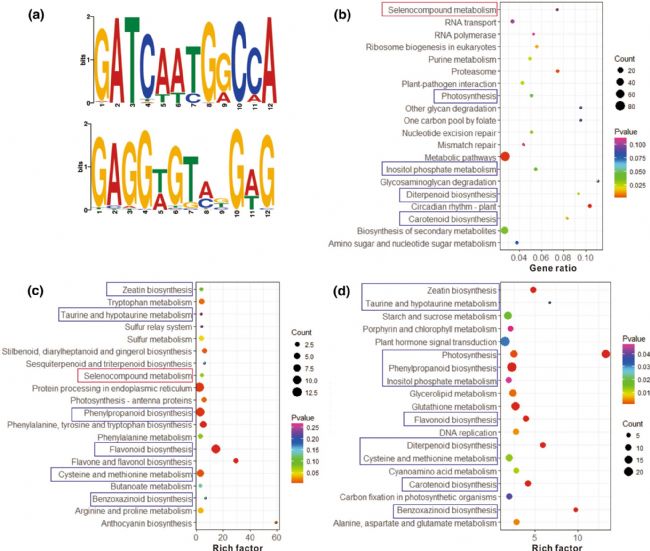 (a)ZmR1結(jié)合的置信度高的兩種motifs,“GATCAATGGCCA”和“GAGGWGTMBGWG”的motifs E值分別是 4.6e-311和1.3e-268。(b) 由DAP-seq鑒定的ZmR1的靶基因富集的前20個(gè)代謝途徑。(c) RNA-seq分析CQ01和B73的中脈,鑒定了DEGs富集的前20個(gè)代謝途徑。(d) RNA-seq分析野生型和過表達(dá)ZmR1CQ01的京724的葉片,鑒定了DEGs富集的前20個(gè)代謝途徑。