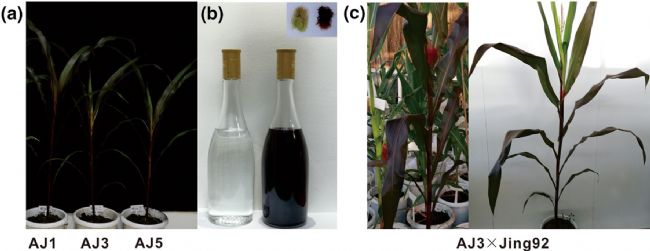 (a) 過表達(dá)ZmR1CQ01京724植株由綠色變?yōu)樽仙?b)過表達(dá)ZmR1CQ01京724的紫色玉米將白酒變?yōu)榧t色。(c) 過表達(dá)ZmR1CQ01京724和京92雜交得到的田間玉米雜交種京科968植株是紫色的。
