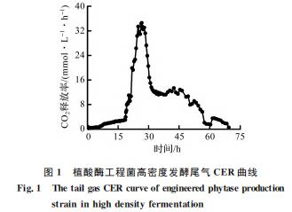 在山東省科學 院 生 物 研 究 所 承 擔 的“植 酸 酶 工 程菌高密度發酵智能控制關鍵技術”(山東省重點研 發計劃項目 2016ZDJS07A20) 項 目 中,在 10L 實 驗 室發酵罐上,采用 FGA 發 酵 尾 氣 分 析 儀,對 重 組 畢 赤酵母表達植酸酶過程進行實時在線檢測 。 發酵溫 度 30 ℃,初 始 發 酵 液 體 積 7L,通 氣 量 5L/min,攪拌轉速 200r/min 。 發酵 6h5min 時,CER 開 始 緩 慢上升;發 酵 25h26 min 時,CER 出 現 快 速 上 升, 曲線上形成明顯的 臨 界 點,預示發 酵進入對數生長 期,此時 立刻調整攪拌轉速至 400r/min;之 后 隨 著 CER 的上升,階段性小步調整攪拌轉速達 530r/min, 并保持至 發 酵 48h30 min,之 后調整攪拌轉速至 500r/min,直至 發 酵 結 束 。 該 發 酵 過 程 的 CER 變 化曲線如圖 1 所示 。在該過程中,發 酵 15h 時 進 行 甲醇誘導,誘 導 5h 后 開 啟 蛋 白 表 達,SDS-PAGE 檢 測植酸酶表達見文獻[18],最終酶活達 3 000U/mL。