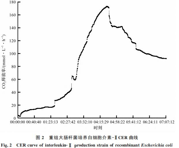應 用 發 酵 尾 氣 分 析 技 術,可 以 直 觀 地 辨 識 菌 體 生長的各個階 段 。 一般在對 數生長期的后期,即 培 養基中葡萄糖剛剛 耗 盡,細胞濃度增加緩慢或略有 下降時,尾氣分析的 CER 曲線會出現一個由上升轉 為下降的臨界點,利用該臨界點可 以方便地確定誘 導時機,及時進行乳糖誘導 。