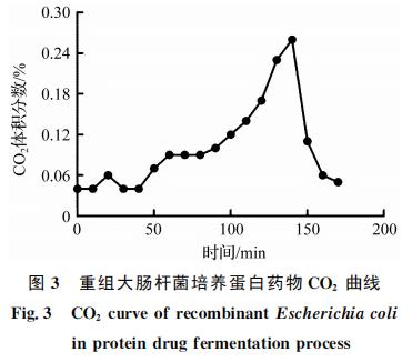 在廣東某高校進行的重組大腸桿菌發酵 藥 物 蛋 白實驗中,發酵開始后,經過短暫的遲緩期,CO2 曲線 開始緩慢上 升,約 2h 后 發 酵 快 速 進 入 對 數 生 長 期; 20min后,CO2 曲 線 突 然 出 現 了 下 折,CO2 體積分數 迅速下降,在不到 30min 的時間內下降到接種前水平, 鏡檢觀察,發現此時發酵液中的工程菌已經消失,判斷 感染了噬菌體,隨即停止發酵,并迅速進行滅菌處理。 該實驗過程的 CO2 體積分數變化曲線如圖 3 所示。