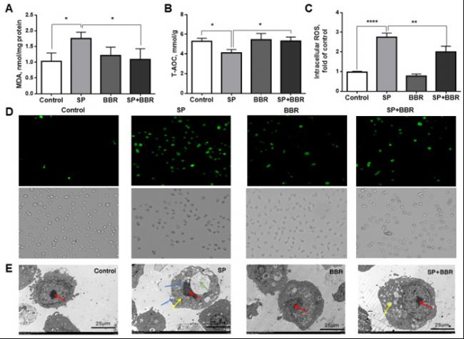 (A) MDA(丙二醛)。(B) T-AOC(總抗氧化能力)。(C) ROS相對表達。(D) ROS熒光顯微鏡圖片。