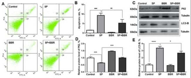 圖2:小檗堿對棕櫚酸鈉誘導的肝細胞凋亡和自噬的影響。