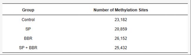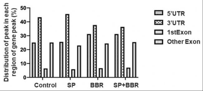 從四個實驗組收集細胞:對照組(control)、脂質沉積組(SP)、小檗堿組(BBR)和脂質沉積+小檗堿組(SP+BBR),采用MeRIP-seq高通量測序進行甲基化分析,以研究小檗堿對脂質沉積誘導斑馬魚細胞m6A甲基化的影響。如下表所示,在甲基化位點數上,小檗堿組檢測到的甲基化位點最多,其次是脂質沉積+小檗堿組和對照組,脂質沉積組檢測到的甲基化位點最少。結果表明,脂質沉積和小檗堿的添加會影響斑馬魚肝細胞m6A甲基化位點數量。