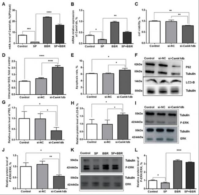 (A)ZFL中Camk1db基因的m6A甲基化水平。(B)Camk1db基因在ZFL中的相對mRNA表達。(C)肝細胞活性。(D)細胞內ROS相對表達。(E)細胞凋亡率。(F)LC3-B和P62蛋白的WB圖。(G)P62蛋白的相對含量。(H)LC3-B蛋白的相對含量。(I,J)P-ERK/ERK蛋白轉染前后的WB圖和相對水平。(K,L)不同處理組(對照組、SP組、BBR組、SP+BBR組)P-ERK/ERK蛋白的WB 圖和相關蛋白表達。
