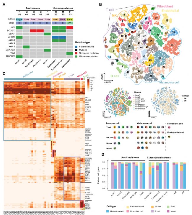 黑色素瘤——一種黑色素細(xì)胞病變而成的腫瘤,正常的黑色素細(xì)胞多存在于皮膚表皮的基底層,它會產(chǎn)生黑色素,并傳遞給周圍的角質(zhì)形成細(xì)胞,黑色素停留在這些細(xì)胞的細(xì)胞核上,以防止染色體受到光線輻射受損;當(dāng)長期經(jīng)歷日光紫外線的照射時,皮膚白皙、對紫外線防護(hù)差的人,體內(nèi)正常的黑色素細(xì)胞會發(fā)生基因突變,變成能夠無限繁殖、擴增的惡性細(xì)胞,進(jìn)而導(dǎo)致黑色素瘤,這種皮膚黑色素瘤(CM)常見于白人,黃種人和黑人罹患的概率相對小,但黑色素瘤并不只有這一種,研究顯示,在亞洲人群中,多發(fā)肢端黑色素瘤(AM),如手指、腳趾、足底部位等,約占東亞黑色素瘤病例的50%。肢端接觸紫外線極少,因此AM的發(fā)病原因并不同于CM,不同的發(fā)病機制最終也導(dǎo)致一些適用于CM的免疫治療手段,在AM病人身上表現(xiàn)并不理想。
