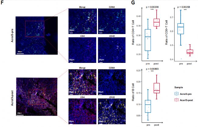 除了單細(xì)胞測序,研究團隊還用了Absin五色多重?zé)晒饷庖呓M化染色試劑盒(abs50013),在組織原位對相關(guān)免疫靶點進(jìn)行多重染色,從蛋白層面進(jìn)一步做論證。結(jié)果顯示:肢端型黑色素瘤(AM)處于耗竭型狀態(tài)的CD8+ T細(xì)胞,同時高表達(dá)TIM-3和PD-1(圖2);單獨應(yīng)用抗PD-1藥物免疫治療后,AM患者的CD8+T細(xì)胞較治療前細(xì)胞比例下降,而CD4+T細(xì)胞和B細(xì)胞比例上升,指示單純抗PD-1治療對AM患者無效(圖3)。
