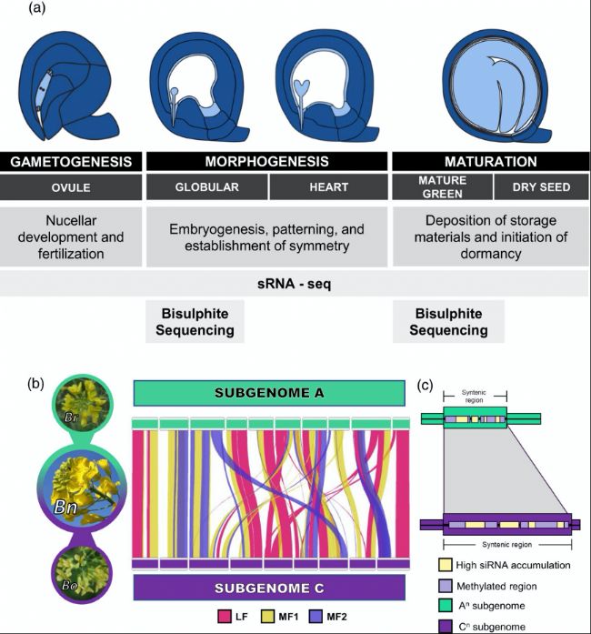 多倍體是被子植物基因組進(jìn)化中的一種持續(xù)現(xiàn)象,有助于現(xiàn)存開花植物的多樣性。甘藍(lán)型油菜(Brassica napus)是世界上最重要的被子植物油料作物品種之一,起源于Brassica rapa(An)和Brassica oleracea(Cn)的種間雜交。盡管轉(zhuǎn)錄組學(xué)中基因組優(yōu)勢(shì)的趨勢(shì)開始顯現(xiàn),但多倍體在生殖發(fā)育過(guò)程中的表觀遺傳學(xué)和小RNA(small RNA,sRNA)調(diào)控機(jī)制知之甚少。種子是向新孢子體代的關(guān)鍵發(fā)育過(guò)渡,并隨時(shí)間發(fā)生表觀遺傳修飾。雙二倍體(amphidiploids)種子發(fā)育的協(xié)調(diào)需要祖細(xì)胞(Progenitor cell)基因組的表觀遺傳平衡。雖然DNA甲基化和RNA干擾是支持發(fā)育的關(guān)鍵過(guò)程,但將它們與種子發(fā)育聯(lián)系起來(lái)的許多細(xì)節(jié)仍在出現(xiàn),尤其是在異源多倍體中。