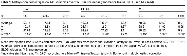 表1:甘藍(lán)型油菜葉片、GLOB期和MG期種子基因組上1 kb窗口的甲基化百分比