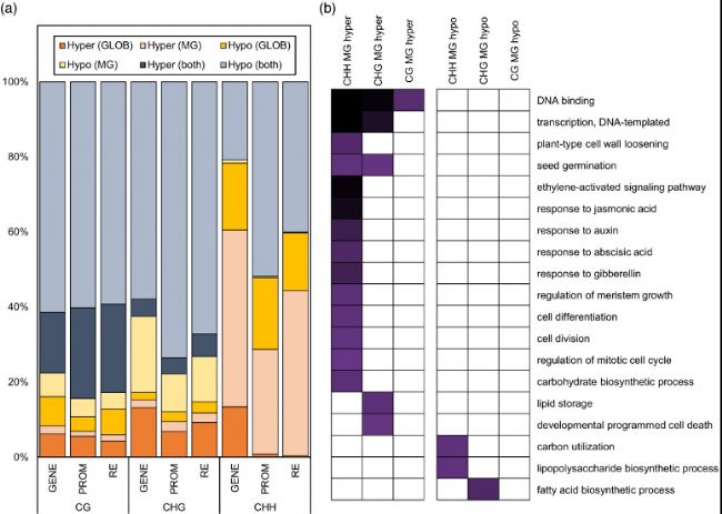 - 百分比堆積柱形圖顯示球形期(GLOB)種子和綠熟期(MG)種子以及葉片之間的高甲基化和低甲基化基因(GENE)、1 kb上游調(diào)控區(qū)(啟動(dòng)子,PROM)和轉(zhuǎn)座元件(transposable element,TE)。分別為GLOB期種子(橙色)或MG期種子(淺橙色)中的高甲基化,GLOB期種子(黃色)或MG期種子(淺黃色)中的低甲基化,GLOB期種子和MG期種子中的高甲基化(深藍(lán))或低甲基化(淺藍(lán))。