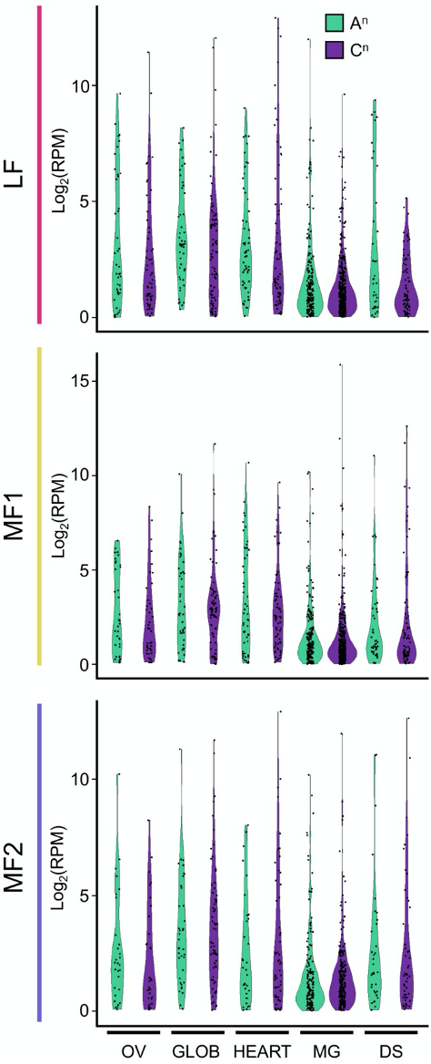 圖7:種植發(fā)育OV期、GLOB期、heart期、MG期和DS期的最少縮減(LF)和最多縮減(MF1和MF2)基因組>1 read/M(RPM)siRNA位點(diǎn)小提琴圖