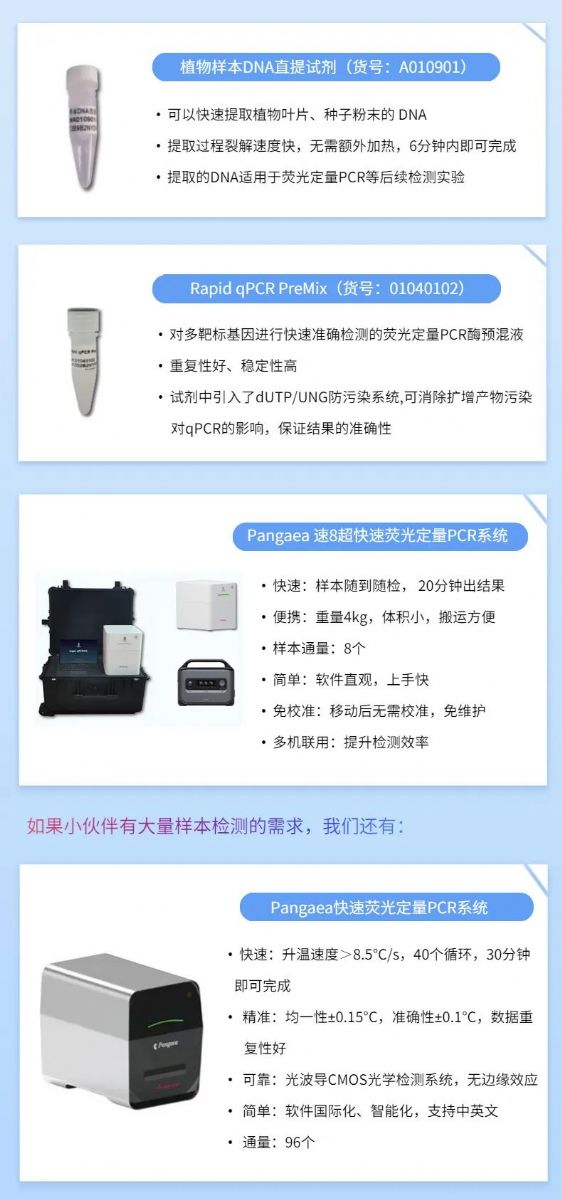 師兄:是呀,利用盤古速8超快速熒光定量PCR系統(tǒng),快提和快檢都可以在實驗田進行了,快速便捷。