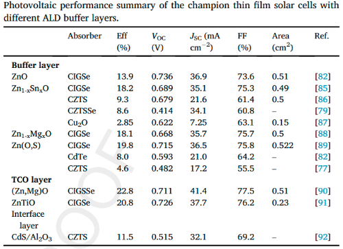ALD在薄膜太陽能電池上的應用主要是由對納米層沉積和界面改性的要求驅動的,按功能層可將其分為吸收層,緩沖層,界面鈍化層和透明導電氧化物層等。金屬氧化物在有機、鈣鈦礦及硅/鈣鈦礦疊層等高效電池的制備中也有廣泛的應用。無論是作為電子/空穴傳輸層、復合層還是封裝層,ALD一直扮演著至關重要的角色。