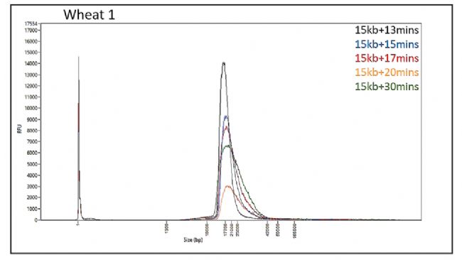 小麥基因組DNA經(jīng)打斷儀處理后,使用PippinHT回收目標(biāo)片段。使用“Range+T”回收模式,不同樣本的回收起點(diǎn)均設(shè)置為15kb,回收時(shí)間分別設(shè)置為13-30min。