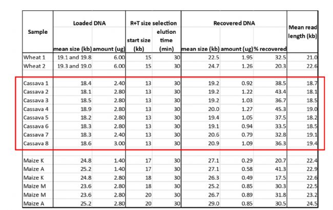 8個(gè)木薯樣本的基因組DNA被打斷成13-25kb(平均長(zhǎng)度18kb),“Range+T”模式設(shè)置為13kb+30min進(jìn)行片段回收,回收得率在33-45%之間,回收后平均片段長(zhǎng)度在19-20kb之間,HiFi reads結(jié)果長(zhǎng)度保持一致。