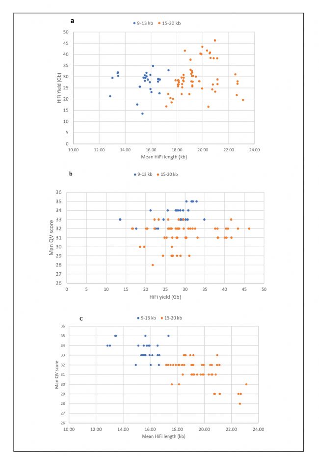為了研究測(cè)序結(jié)果在產(chǎn)量、read質(zhì)量和平均HiFi read長(zhǎng)度之間得到更好的平衡,作者對(duì)比了PippinHT 之前軟件版本9-13kb篩選模式的測(cè)序結(jié)果(圖5中的藍(lán)色符號(hào))與最新“Range+T” 模式的測(cè)序結(jié)果(圖5中的橙色符號(hào))。使用“Range+T”模式,回收起點(diǎn)設(shè)置為15kb,其產(chǎn)生的reads平均長(zhǎng)度在21-22kb以上,且30-40kb長(zhǎng)度reads數(shù)量有顯著提高。更重要的是,數(shù)據(jù)(圖5a)表明在13kb至22kb的范圍內(nèi),隨著平均HiFi read長(zhǎng)度的增加,HiFi測(cè)序數(shù)據(jù)產(chǎn)量幾乎沒(méi)有下降。由于PacBio測(cè)序中聚合酶讀取長(zhǎng)度有限,短的SMRTbell文庫(kù)比長(zhǎng)文庫(kù)具有更高的QV分?jǐn)?shù),但此次實(shí)驗(yàn)中較長(zhǎng)文庫(kù)的最低平均QV分?jǐn)?shù)仍然相當(dāng)好,為28。88%的較長(zhǎng)文庫(kù)(橙色符號(hào))的平均QV得分在30以上(圖5.b-c)。