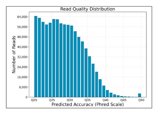 為了更好地說(shuō)明較長(zhǎng)文庫(kù)的質(zhì)量結(jié)果,圖6顯示了一個(gè)平均subreads長(zhǎng)度為22.6kb的玉米樣本的reads質(zhì)量分布,其中約40%的reads得分在Q30以上。