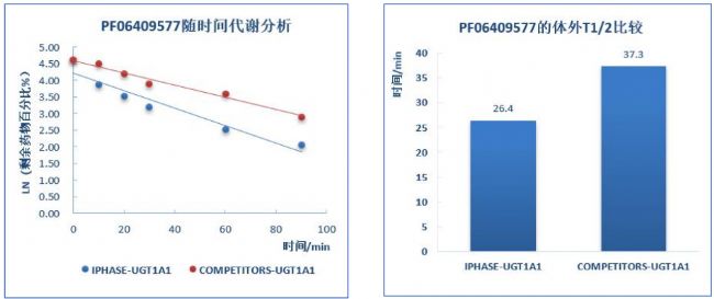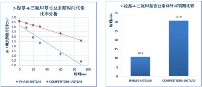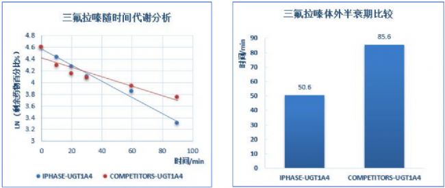 IPHASE選用自研UGT重組酶和某一知名品牌UGT重組酶為代謝系統,在相同實驗條件下進行了體外孵育試驗,