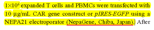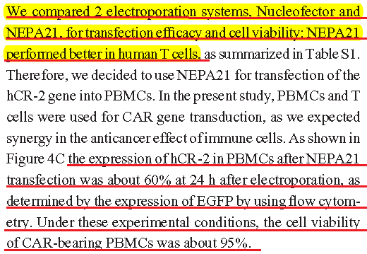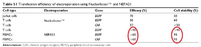 “我們比較了2種電穿孔系統,即Nucleofector和NEPA21,其轉染效率和細胞存活率:NEPA21在人T細胞中轉染效率較高。因此,我們決定使用NEPA21轉染hCR-2基因到PBMCs。(表S 1)”