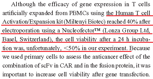 文中表明,“使用原代細胞核酸轉染儀(Lonza Group Ltd, Basel, Switzerland)轉染T細胞,轉染效率達到40%,但遺憾的是,在其實驗中,培養24小時后的細胞存活率為低于50%。由于我們使用原代細胞來評估單鏈抗體在CAR和融合蛋白中的聯合抗癌作用,因此在基因轉染后提高細胞存活率非常重要。”