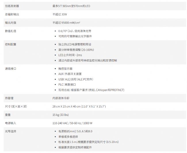 高功率多波段UV-LED點光源規格參數表: