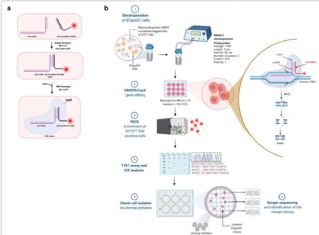 圖1 在RTgutGC細胞中轉染核糖核蛋白(RNP)復合物。a. RNP的合成過程;b.細胞電轉染及CRISPR/Cas9基因編輯流程。
