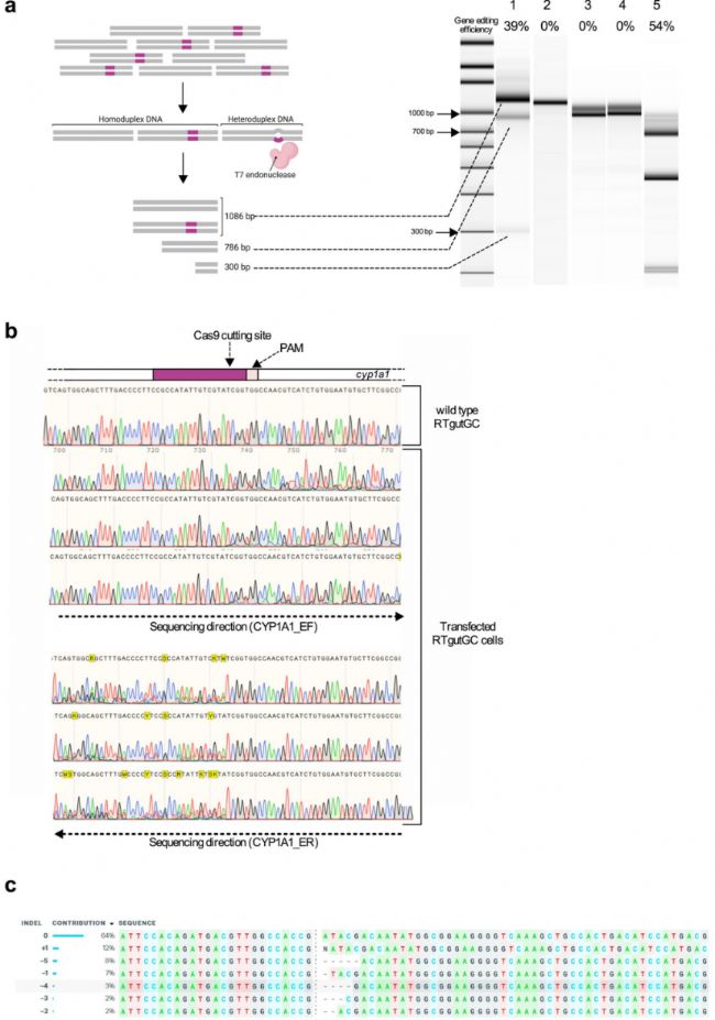 隨后,研究人員先將cas9蛋白與crRNA:tracrRNA-ATTO™550雙鏈合成核糖核蛋白(RNP)復合物(圖1a)。采用上述電穿孔參數,對RTgutGC細胞進行電穿孔并將RNP復合物導入到細胞內,用以敲除cyp1a1基因(圖1b)。電穿孔48h后,使用ATTO™550信號進行流式細胞儀分選,并在96孔板中培養后依次傳到更大的細胞培養孔板上,以便提取細胞基因組DNA進行基因分型。最后,采用T7內切酶(T7EI)分析和ICE分析分別評估CRISPR/Cas9誘導的基因編輯效率和突變的性質,最后通過低密度接種和克隆環細胞分離法獲得克隆細胞(圖1b)。