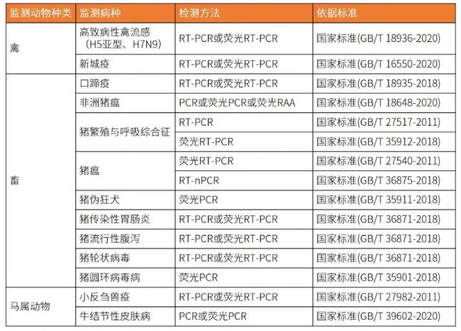 現階段主流的動物疫病檢測方法主要有傳統檢測、血清學檢測和核酸檢測。核酸檢測作為動物疫病檢測中常用的方法之一,具有實驗周期短、靈敏度高、特異性強、實時定量等優勢。常見動物疫病病原核酸檢測方法及依據標準如下: