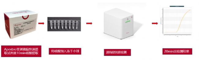 盤古 Super 8搭配Apexbio非洲豬瘟快速提取試劑盒和熒光定量PCR酶預混液,從快速核酸提取到出檢測結果,一站式解決,簡單方便快速。