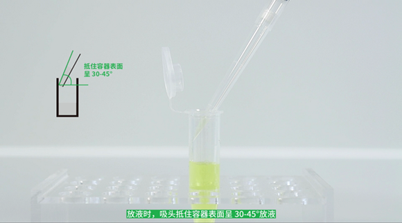 放液時*,吸頭抵住容器表面呈30-45°放液。