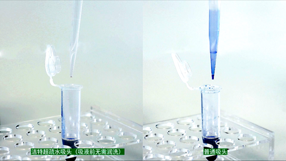 潔特生物ZEROTIP®超疏水吸頭吸液前吸頭無需潤洗,可直接進行移液操作,極大地提高了移液操作效率。