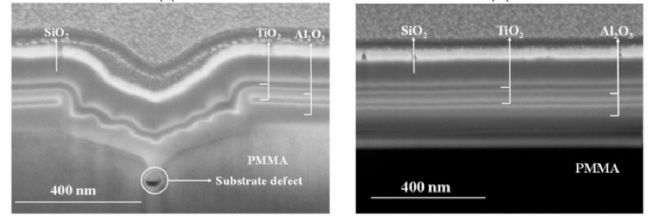 ALD薄膜以飽和吸附的layer-by-layer生長模式,可在結構復雜的幾何表面,如大曲面及高縱深比深孔結構,大面積形成高均勻性薄膜,且膜層相較于PVD膜更為致密,在界面處的結合力更強(圖2-3),更適用于未來工業界先進精密光學器件的制造。