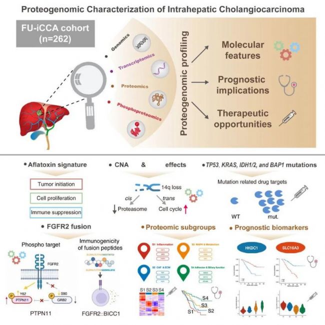 2021年底,復旦大學附屬中山醫院樊嘉院士團隊高強教授、中科院上海藥物所周虎研究員、中科院分子細胞科學卓越創新中心高大明研究員等合作在期刊Cancer Cell發表了題為“Proteogenomic characterization identifies clinically relevant subgroups of intrahepatic cholangiocarcinoma”的研究論文,在該研究中,樊嘉院士團隊發現TP53、KRAS、FGFR2、IDH1/2、BAP1突變(融合)是肝內膽管癌的主要驅動基因變異。
